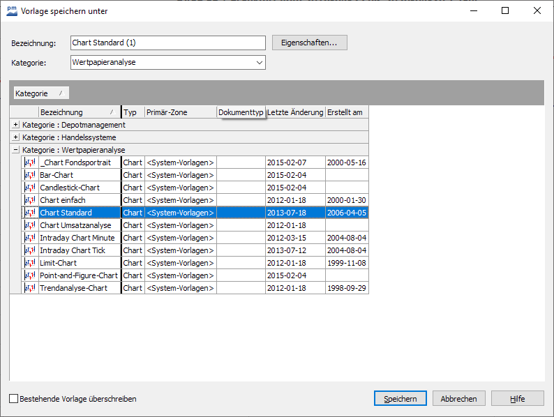 Die Vorlagen für Charts speichern zahlreiche Einstellungen, vom Hintergrund über den Zeitraum bis zu den Einstellungen der Indikatoren. Sie können eine aktive Chartvorlage beliebig verändern und die Änderungen abschließend speichern.