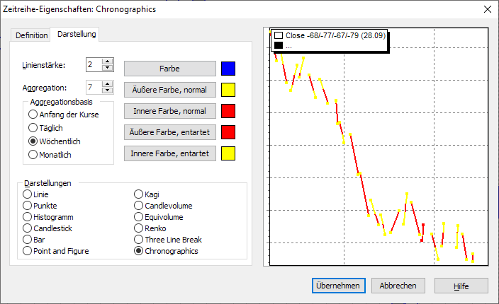 Chronographics sind eine neue, nicht nur optisch sehr interessante Chartform, die Ihnen der Infront Portfolio Manager zur Verfügung stellt. Der Chart besteht für jeden der im Dialogfenster "Zeitreihe-Eigenschaften" ausgewählten Zeitabschnitte aus einer Linie. Die Linien stellen die Strecke zwischen High und Low in der Periode dar.