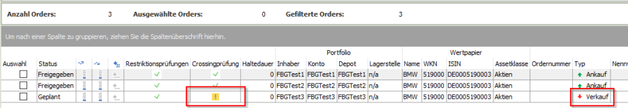 Für Orders auf Portfolios unter Finanzportfolioverwaltung können im Orderbuch vor der Ausführung Crossing-Prüfungen durchgeführt werden. Dabei wird geprüft, ob für Orders mit dem Status "Freigegeben" gegenläufige Orders (crossing orders) existieren – z. B., ob für eine Kauforder für die gleiche ISIN auch eine Verkaufsorder existiert. In der Spalte "Crossing-Prüfung" zeigen Ihnen Symbole an, ob die Prüfungen erfolgreich waren oder der Freigabeprozess gestoppt wird.