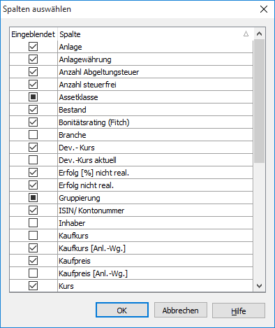 | Diese Spalten sind aktiviert und somit eingeblendet. |