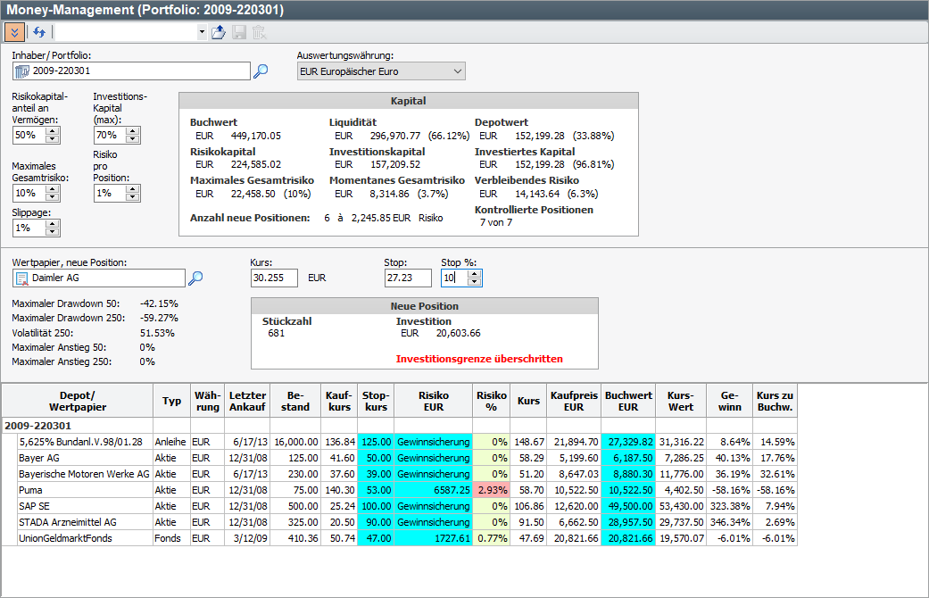 Das Money-Management-Werkzeug enthält eine spezielle Vermögensübersicht, die Verwaltung von Limits ermöglicht, eine Risikoauswertung vornimmt und einen Positionsrechner bereitstellt.