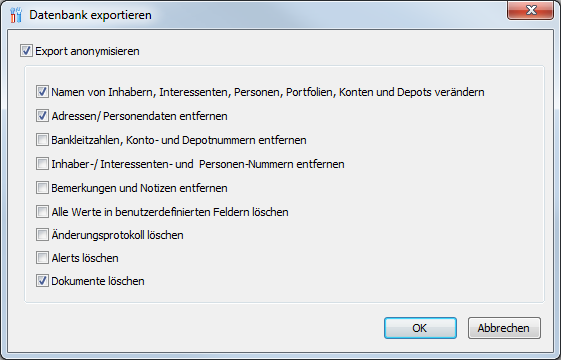 In diesem Dialogfenster werden mit dem Export gleichzeitig Optionen zur Anonymisierung der Datenbank angeboten.Diese Optionen "löschen" bzw. "entfernen" diese Daten natürlich nicht aus der Original-Datenbank, sondern lediglich aus der exportierten Kopie. Haben Sie also z. B. das Kontrollkästchen "Dokumente löschen" aktiviert, so werden die Dateien, die im Dokumenten-Archiv (internes Dokumentenmanagementsystem) gespeichert sind, nicht exportiert.