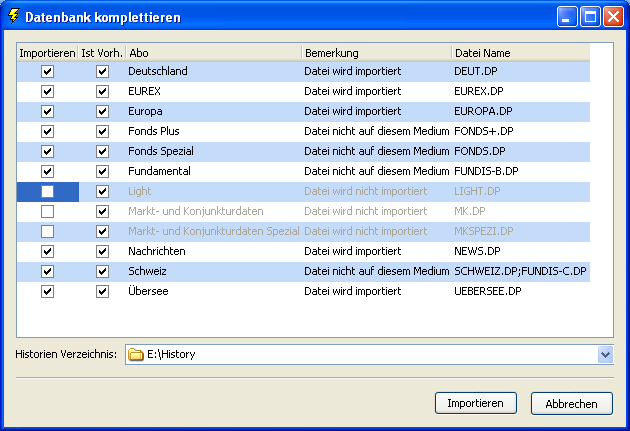 Nach dem Erscheinen eines Informationsfensters, das Sie nach dem Durchlesen mit "Weiter" verlassen, erscheint das Dialogfenster "Datenbank komplettieren". Hier sind bereits die Daten ausgewählt, die bei Ihren Abonnements importiert werden müssen, um Ihre Datenbank zu komplettieren.