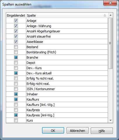 Es erscheint das Dialogfenster "Spalten auswählen".