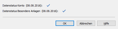 Analog können Sie den Datenstatus auch in den Stammdaten von Portfolios, Depots oder Konten setzen. Für Konten wird noch unterschieden in die Bereiche "Datenstatus Konto" und "Datenstatus Besondere Anlagen".