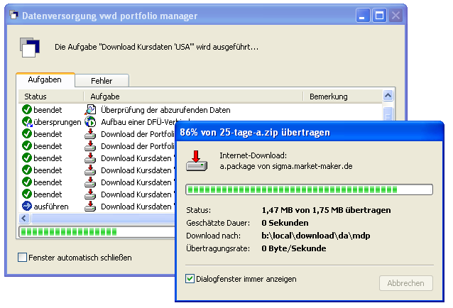 Neben dem aktuellen Status erhalten Sie auf der Registerkarte "Aufgaben" auch die genaue Bezeichnung der Aufgabe. Infront Portfolio Manager vergleicht darüber hinaus den Stand Ihrer Daten mit dem Server und berechnet die Größe der Lücke in Ihrem Datenbestand.