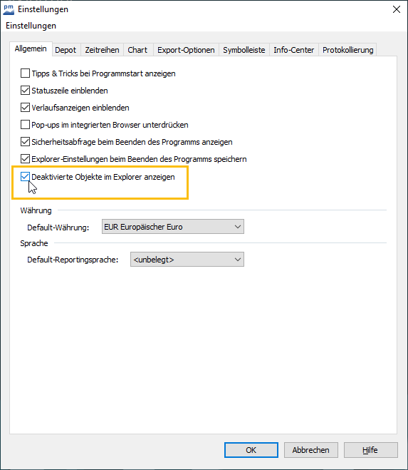 Um die deaktivierten Depotobjekte wieder auszublenden, deaktivieren Sie das Kontrollkästchen "Deaktivierte Objekte im Explorer anzeigen" in den allgemeinen Einstellungen wieder.
