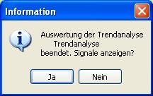 Meldung bei Auswertungsende | Dieses Kontrollkästchen ist nur verfügbar, wenn Sie die Trendanalyse-Eigenschaften über den Befehl EIGENSCHAFTEN im Kontextmenü des Trendanalyseordners im Explorer geöffnet haben (<F12>). Aktivieren Sie dieses Kontrollkästchen, so erscheint nach dem Ende der Auswertung eine Information über gefundene Signale. Das ist besonders sinnvoll, wenn der Trendanalyseordner nach dem Datenabruf automatisch ausgewertet wird.