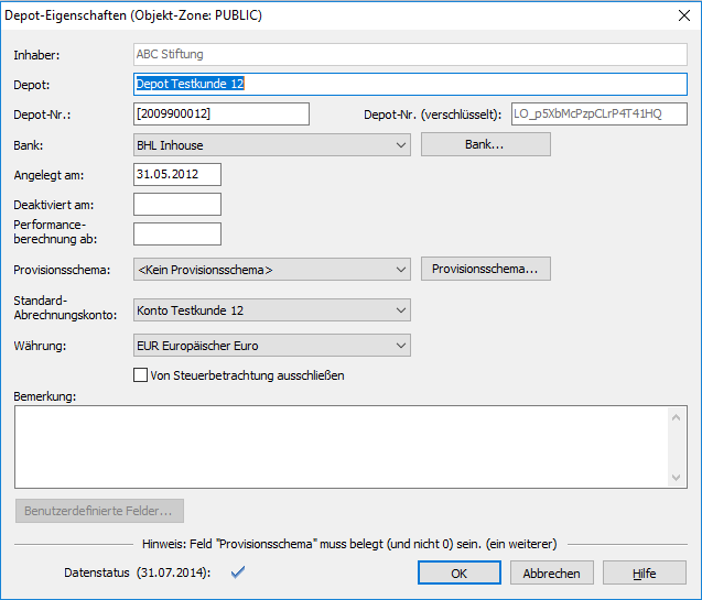 Für ein neu angelegtes Depot mit Depotnummer bzw. für neu eingegebene Depotnummern wird die verschlüsselte Depotnummer erst nach dem Schließen des Dialogfensters mit "OK" beim nächsten Aufruf der Depot-Eigenschaften angezeigt.