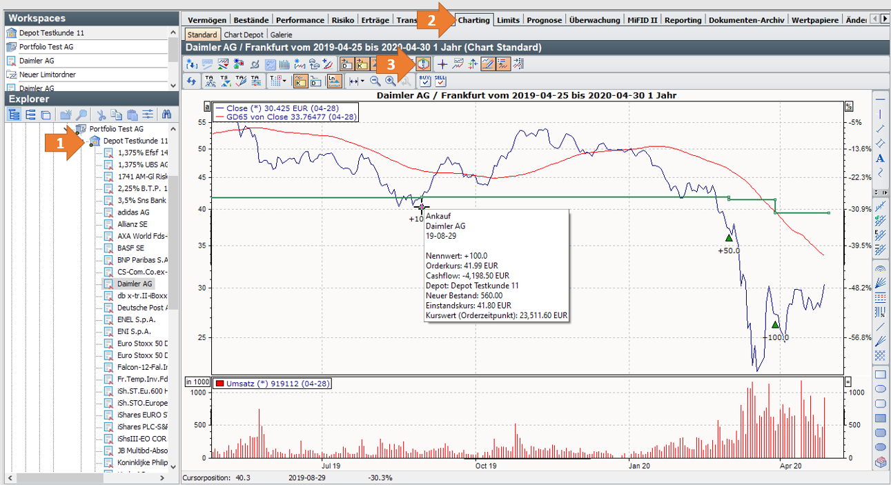 Für die Wertpapiere, die in einem Depot vorhanden sind, können Sie die An- und Verkaufsdaten mit in den Kursverlauf einblenden.