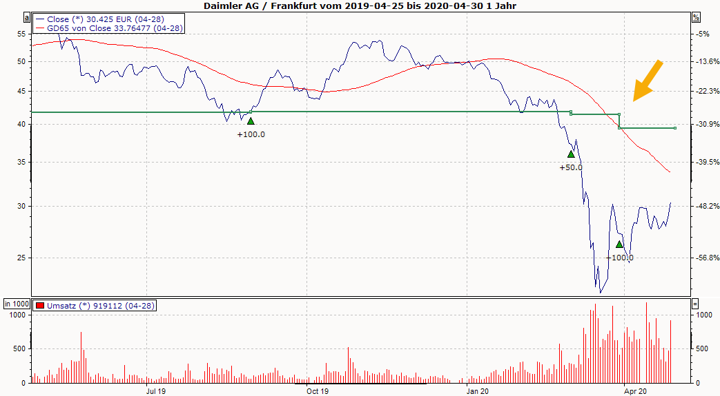 Die Ankäufe werden durch grüne Dreiecke, die Verkäufe durch ein gelbes Gleichheitszeichen im Chart dargestellt.