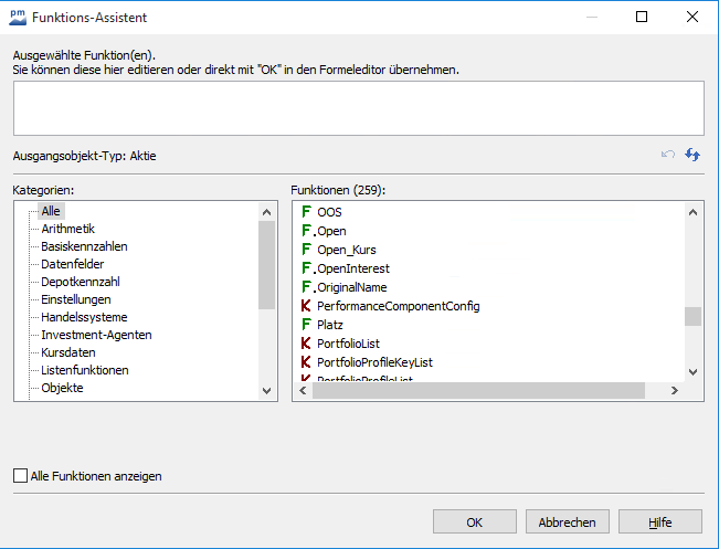 Der Funktions-Assistent zeigt immer nur die jeweils anwendbaren Funktionen an, d. h., deren Ausgangsobjekttyp mit dem Ergebnisobjekttyp der Funktion an der Cursor-Position übereinstimmt. Befindet sich der Cursor z. B. auf der Funktion "Close[]", deren Ergebnisobjekt eine Zeitreihe ist, werden im Funktions-Assistenten nur die Funktionen und Makros angezeigt, deren Ausgangsobjekt eine Zeitreihe ist.