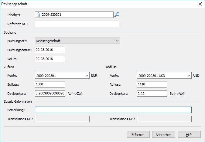- Geben Sie in den Eingabefeldern Ihre Daten ein. Wählen Sie dabei die Konten für Zu- und Abfluss aus und geben Sie Zu- und Abflussbeträge in den jeweiligen Währungen ein. Die zugehörigen Devisenkurse werden automatisch eingeblendet.