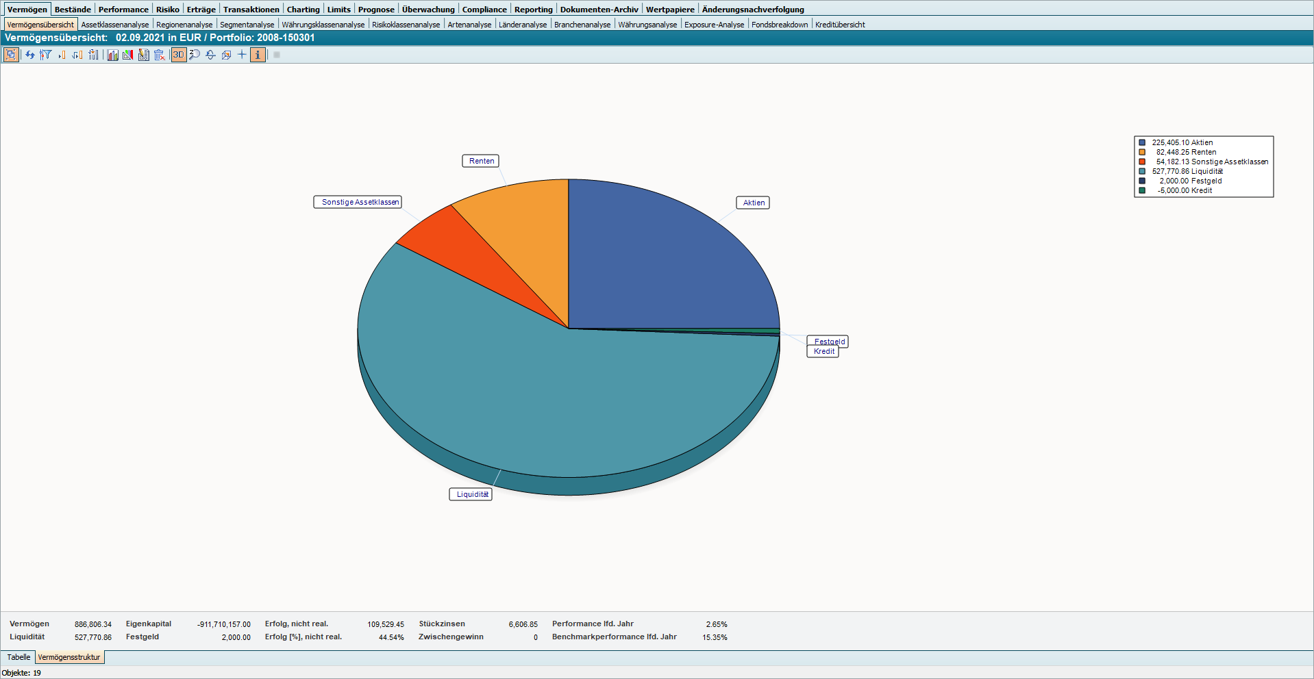 Die Vermögensübersicht öffnet sich als Tabelle. Wählen Sie am unteren Rand des Fensters im Arbeitsbereich die Registerkarte "Vermögensstruktur", um zur Darstellung als Diagramm zu wechseln.