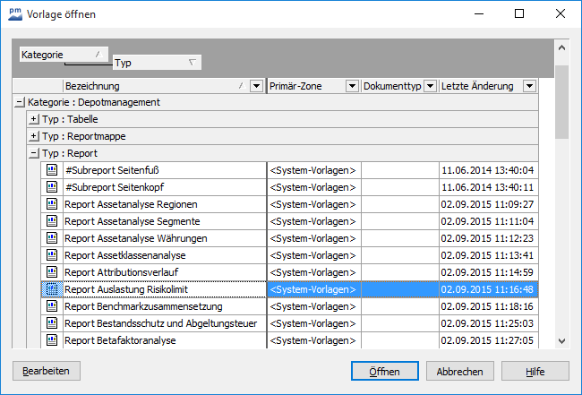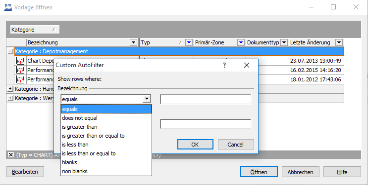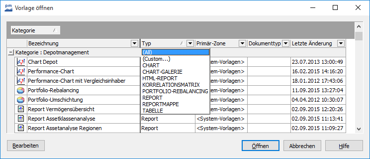 Über den Pfeil rechts in der Spaltenüberschrift können Sie die Elemente zusätzlich filtern. So können Sie sich auf einfache Art und Weise z. B. nur Vorlagen des Typs "Chart" anzeigen lassen.