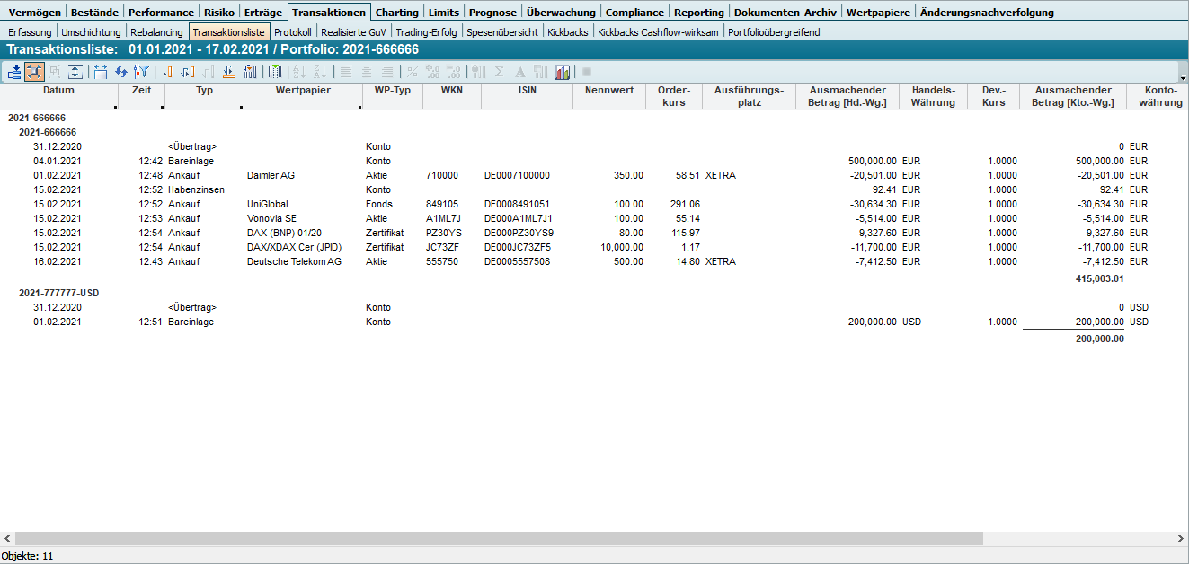 Die Auswertung "Transaktionsliste" listet alle Transaktionen eines Inhabers (oder Portfolios) auf. Standardmäßig ist diese Tabelle nach Inhabern/Portfolios und Konten gruppiert.
