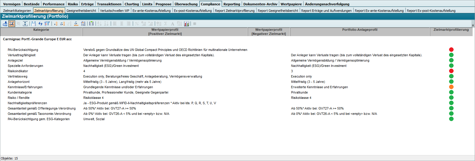 In den geöffneten Workspaces von Portfolios finden Sie die Auswertung auf dem Worksheet "Compliance", "Zielmarktprofilierung".