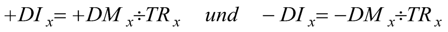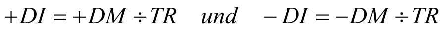 - Berechnung des Directional Indikator (+DI und –DI) durch Division des DM durch die TR: