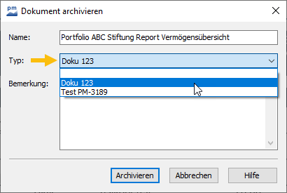 Archivieren Sie nun einen Report mit dem entsprechenden Dokumenttyp über den Befehl ARCHIVIEREN auf der Registerkarte "Report" im Hauptmenü des geöffneten Reports. Wählen Sie dabei als Typ einen der zuvor konfigurierten Dokumenttypen.