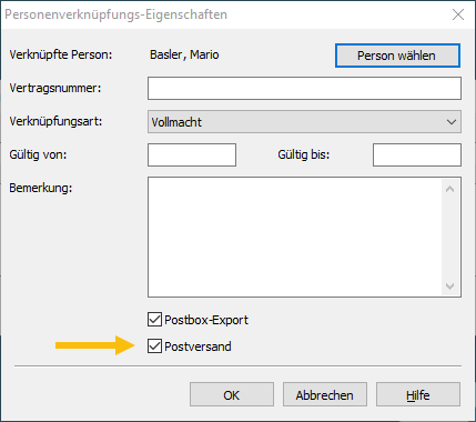 Aktivieren Sie in den Personenverknüpfungs-Eigenschaften das Kontrollkästchen "Postversand" und bestätigen Sie die Eingabe mit "OK".
