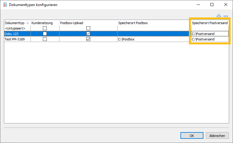 Geben Sie in der Spalte "Speicherort Postversand" den Pfad zur Ablage der Dokumente an.