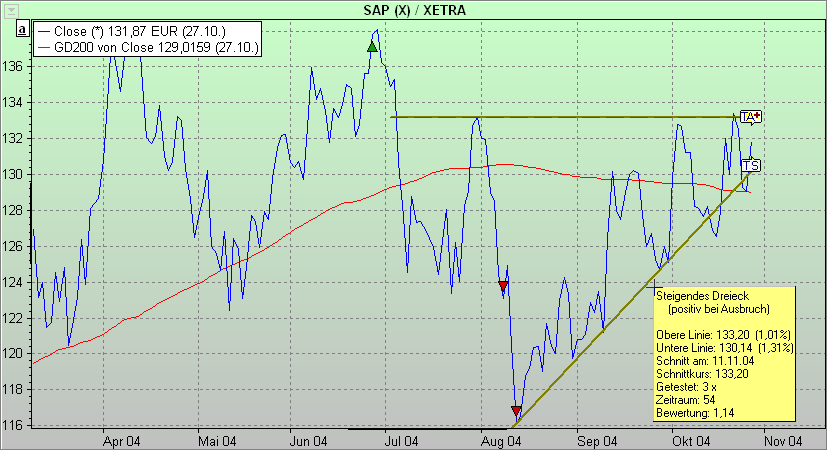 Bei steigenden Dreiecken (Hausse-Dreiecken) ist die obere Linie des Dreiecks eine waagerecht verlaufende Widerstandslinie. Ein Hausse-Dreieck ist generell positiv zu bewerten. Ein Kaufsignal ist jedoch erst bei Durchbruch der oberen Linie gegeben.
