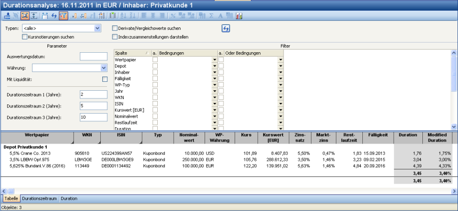 Die Durationsanalyse gibt für jede Anleihe sowie für Festgelder die Kennzahlen Duration, Modified Duration und Convexity wieder.