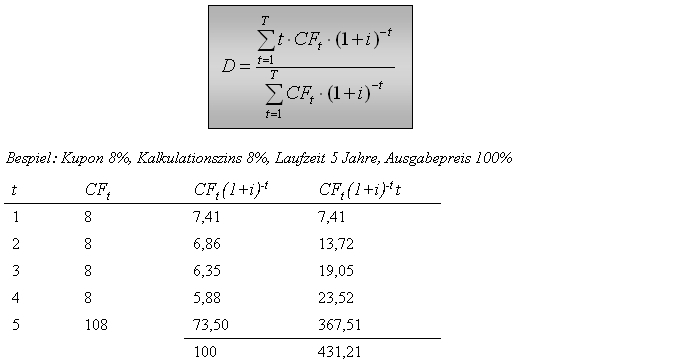Duration | Die Duration ist eine Kennzahl zur Beurteilung des Risikos von Anleihen. Sie ist zu verstehen als die durchschnittliche Bindungsdauer des eingesetzten Kapitals in Jahren. Zu Details sehen Sie das folgende Beispiel und schlagen Sie in der einschlägigen Literatur nach, z. B. in Steiner, Manfred, Bruns, Christoph und Stöckl, Stefan: Wertpapiermanagement; 10. Auflage; ab S. 168. Beachten Sie in diesem Zusammenhang auch die Hinweise im Abschnitt Literatur. |