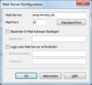 Die Konfiguration umfasst mindestens den Hostnamen des SMTP-Servers und dessen Port. Optional können Sie eine Absende-Adresse für die Benachrichtigungen eintragen. Bei Bedarf muss ein Login zum Mailserver angegeben werden.