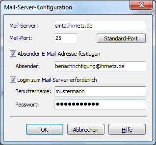 - Tragen Sie im erscheinenden Dialogfenster "Mail-Server-Konfiguration" bei Mail-Server und Mail-Port den SMTP-Server und den entsprechenden Port ein. Bei Bedarf muss noch ein Login zum SMTP-Mailserver angegeben werden.