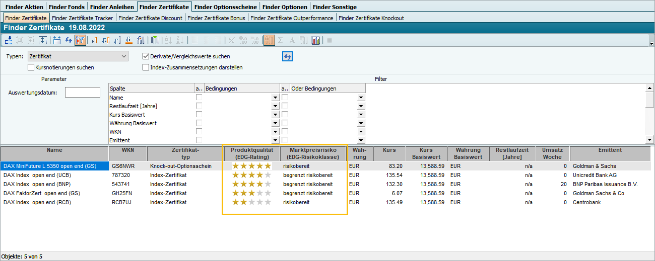 EDG-Zertifikate-Rating im Finder Zertifikate