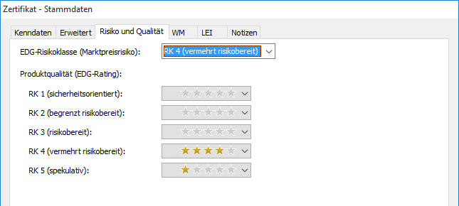 Im Dialogfenster "Zertifikat-Stammdaten" gibt es die Registerkarte "Risiko und Qualität", auf die Sie per Mausklick wechseln können. Dort können Sie das EDG-Zertifikate-Rating des Zertifikats einsehen bzw. bearbeiten.