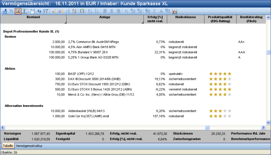 Risikoklasse | (Top-)Risikoklasse der Position. Für Wertpapiere steht hier die EDG-Risikoklasse, die dem Wertpapier in den Stammdaten zugewiesen ist. Für alle anderen Positionen ist die entsprechende Risikoklasse typspezifisch voreingestellt. Sie können diese Zuordnung über das benutzerdefinierte Feld "Risikoklassifikation" auch ändern. |