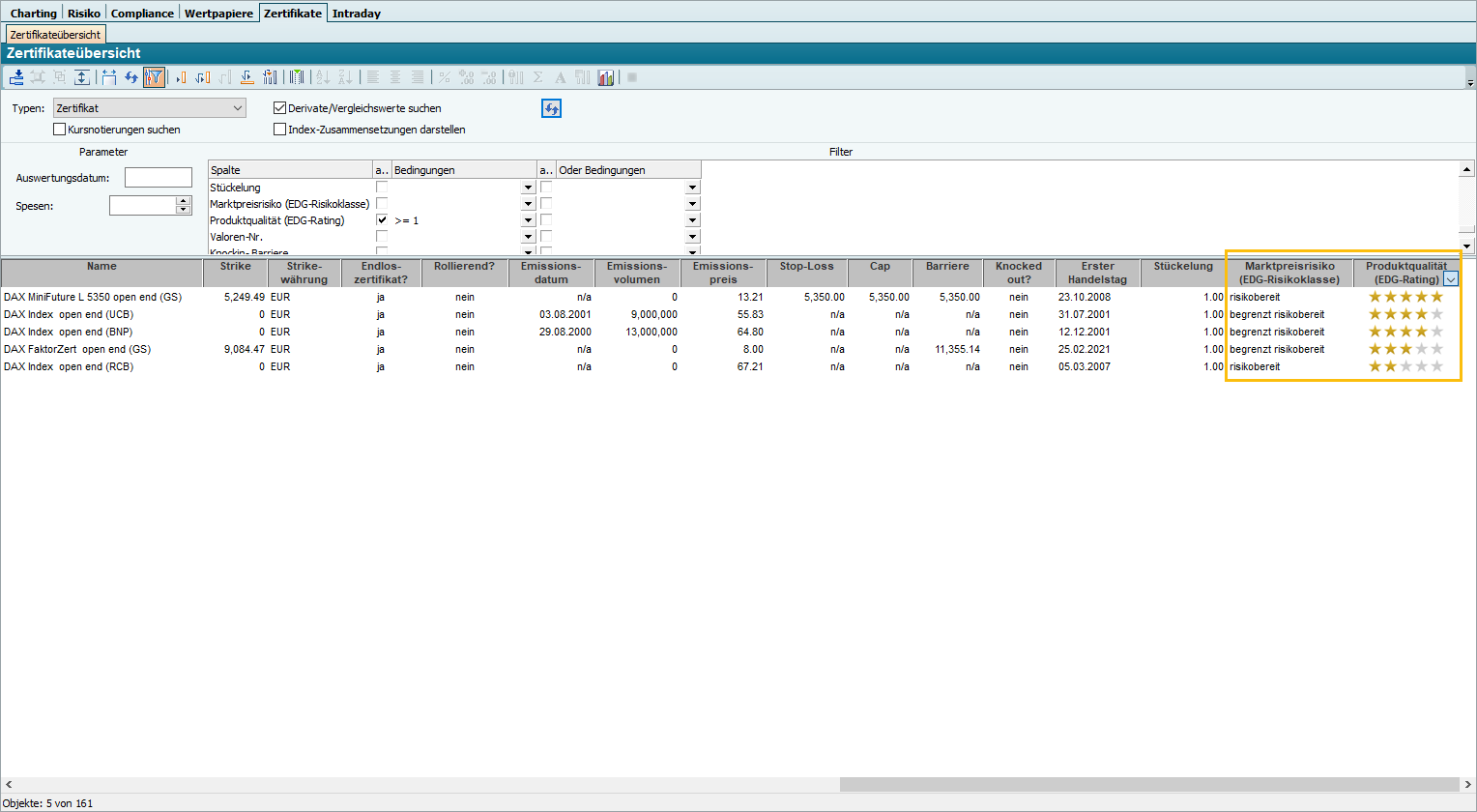 Sie können nach diesen Spalten wie gewohnt filtern. Um z. B. alle Zertifikate mit dem EDG-Zertifikate-Rating "sehr gut" (5 Sterne) zu ermitteln, geben Sie in das Filterfeld im Eingabefeld für den Minimalwert die Zahl "5" ein.