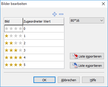 In der Liste im linken Teil des Fensters können Sie Bilder und Werte einander zuordnen: