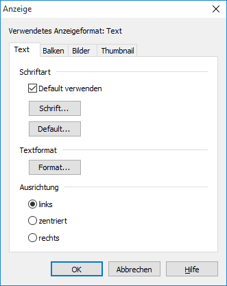 Sie gelangen in das Dialogfenster "Anzeige", in dem Sie auf der Registerkarte "Text" die Form der Textdarstellung festlegen können. Folgende Einstellungen sind möglich: