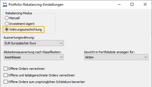 Der neue Rebalancing-Modus "Währungsumschichtung" ist auch in den Einstellungen als Option hinzugekommen: