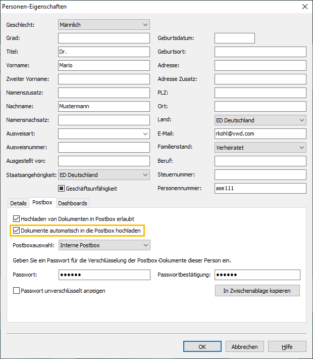 In den Personen-Eigenschaften können Sie festlegen, ob für die jeweilige Person auch automatische Postbox-Uploads erfolgen sollen. Dazu finden Sie auf der Mini-Registerkarte "Postbox" das Kontrollkästchen "Dokumente automatisch in die Postbox hochladen".