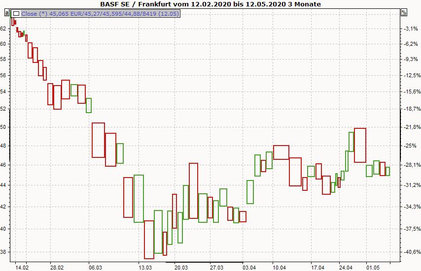 Schlusskurs und Eröffnungskurs werden nicht markiert, aber durch die farbliche Darstellung der Boxen werden positive und negative Tage unterschieden. Wie bei den Bar-Charts wird eine grüne Box gebildet, wenn der Schlusskurs über dem Eröffnungskurs liegt. Liegt der Schlusskurs unter dem Eröffnungskurs wird eine rote Box gezeichnet.