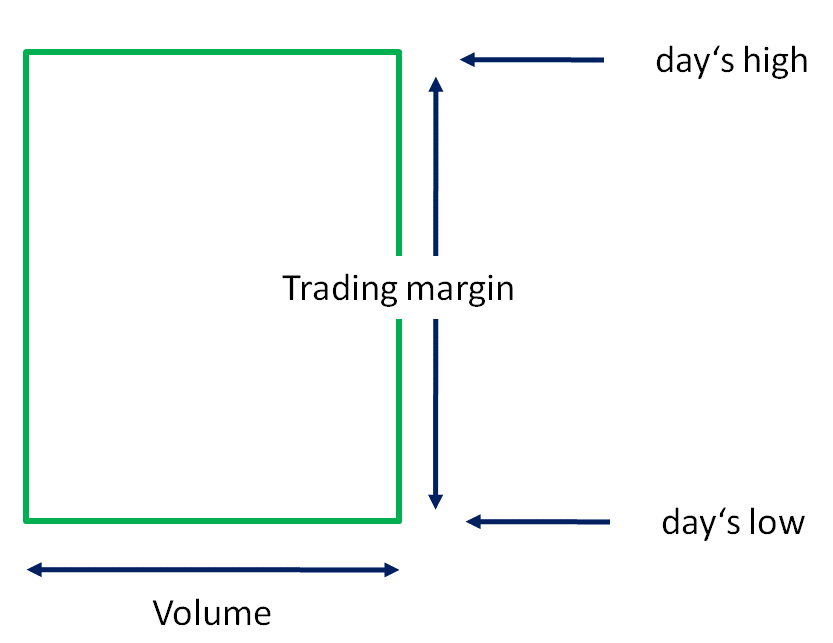 Die Höhe einer Box stellt den Höchst- bzw. Tiefstkurs eines Handelstages dar (Handelsspanne). Die Breite der Box wird vom Umsatz bestimmt. Je breiter eine Box ist, desto größer war der Umsatz.