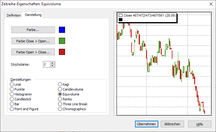 Farbe | Hier ist die Farbe der Zeitreihe definiert. Eine Änderung macht bei den Equivolume-Charts keinen Sinn. |