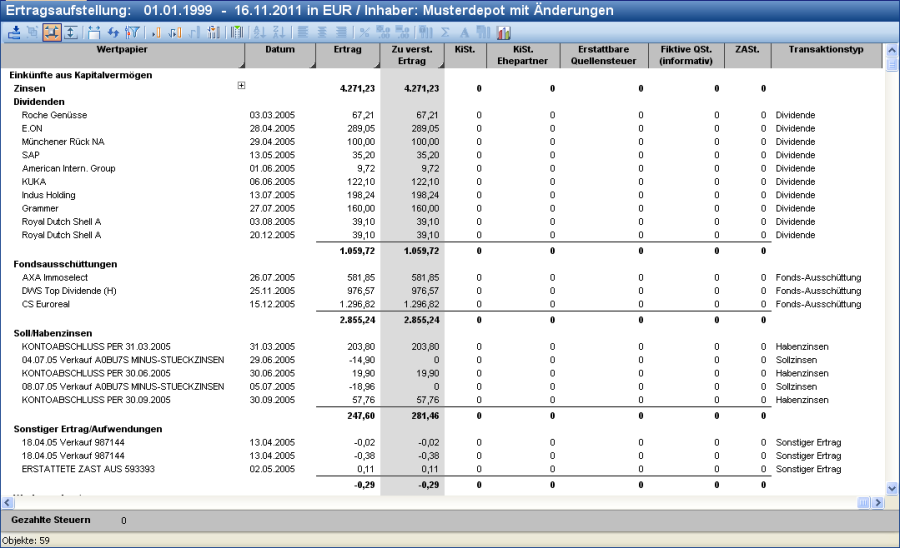 Beachten Sie, dass erhaltene Stückzinsen und Zwischengewinne im Rahmen der "Veräußerungsgeschäfte" aufgeführt werden, während die gezahlten Stückzinsen und Zwischengewinne weiter unter "Zinsen" gelistet werden. Steuernachzahlungen fallen wie die Steuererstattungen unter die Rubrik "Sonstiger Ertrag/Aufwendungen". |