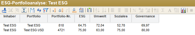 Zur ESG-Analyse von Portfolios auf Inhaber- oder Gruppenebene sowie von Ordner- und Filterinhalten steht Ihnen die Tabelle "ESG-Portfolioanalyse" zur Verfügung.
