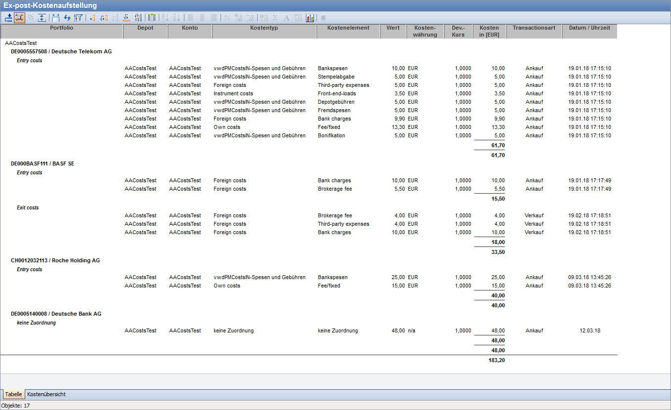 | Kosten in [Auswertungswährung] | Die über den Devisenkurs umgerechneten Kosten in der Auswertungswährung. Die Summe dieser Spalte entspricht (im Standard-Kostenschema) der Summe "Gesamt Finanzinstrumentkosten" im "Report Erträge und Aufwendungen (MiFID II)". |
