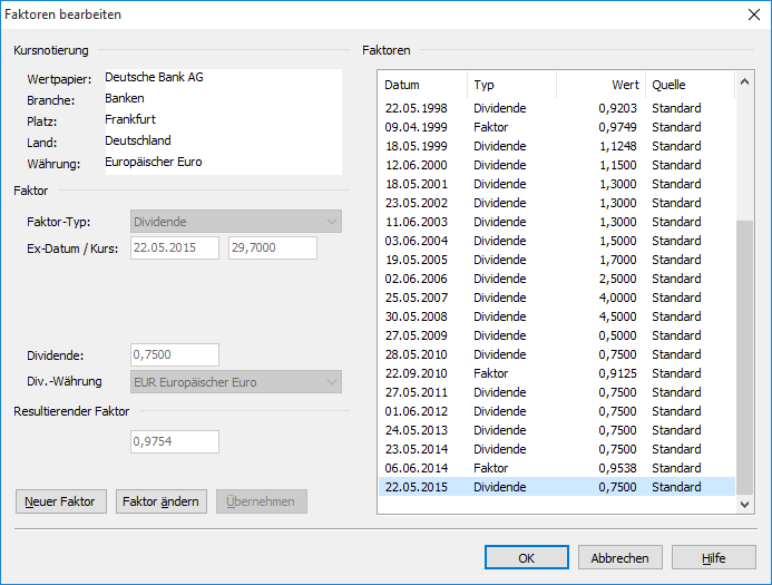Das Dialogfenster enthält links oben einige Wertpapier-Daten zur Information. Rechts wird eine Liste aller Faktoren des Wertpapiers mit Datum, Typ, Wert und Quelle des Faktors dargestellt.