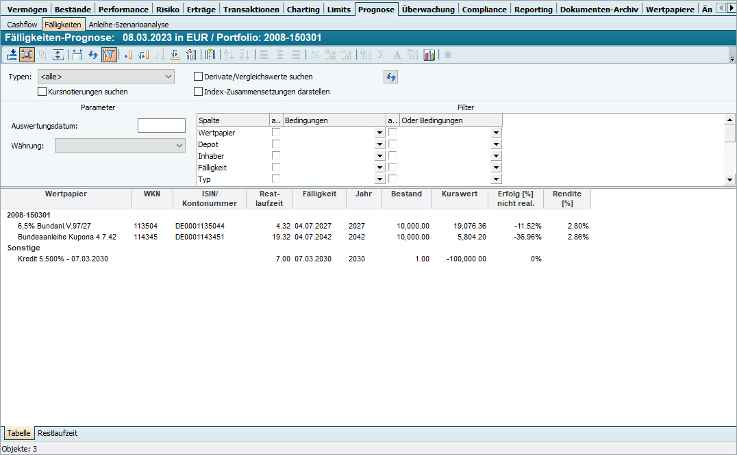 Der Infront Portfolio Manager listet in der Fälligkeiten-Prognose die Restlaufzeiten sowie die Fälligkeitsdaten aller Depotpositionen auf, die einer Laufzeit unterliegen (Anleihen, Optionsscheine, Optionen usw.). Es wird zusätzlich der Bestand, der Kurswert sowie der prozentuale nicht realisierte Erfolg ausgewiesen (entsprechend Vermögensübersicht).