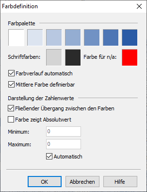 Das erscheinende Dialogfenster "Farbdefinition" erlaubt die Definition einer Farbpalette, die aus sieben Farben besteht. Dabei kann automatisch ein Farbverlauf erzeugt werden (durch Aktivieren des Kontrollkästchens "Farbverlauf automatisch"). In diesem Fall brauchen nur die erste und letzte Farbe bestimmt zu werden. Ist zusätzlich das Kontrollkästchen "Mittlere Farbe definierbar" aktiviert, kann zusätzlich die mittlere Farbe bestimmt werden. Dies ist z. B. nützlich, um die Farbe, die bei einem Zahlwert von 0 dargestellt werden soll, festzulegen. (Setzen Sie in diesem Fall Minimum und Maximum auf "+- einen bestimmten Wert", z. B. "+1,00" und "-1,00".)