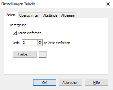 Jede ...te Zeile einfärben | Legt fest, jede wievielte Zeile eingefärbt werden soll. Standard ist die Einstellung "Jede 2. Zeile". |