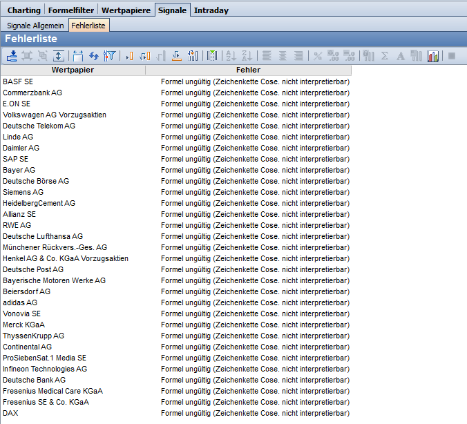 Die Auswertung "Fehlerliste" listet in den Spalten "Wertpapier" und "Fehler" alle Probleme bei der aktuellen Auswertung der Signale von Signal- und Handelssystemen sowie von Formelfiltern auf.