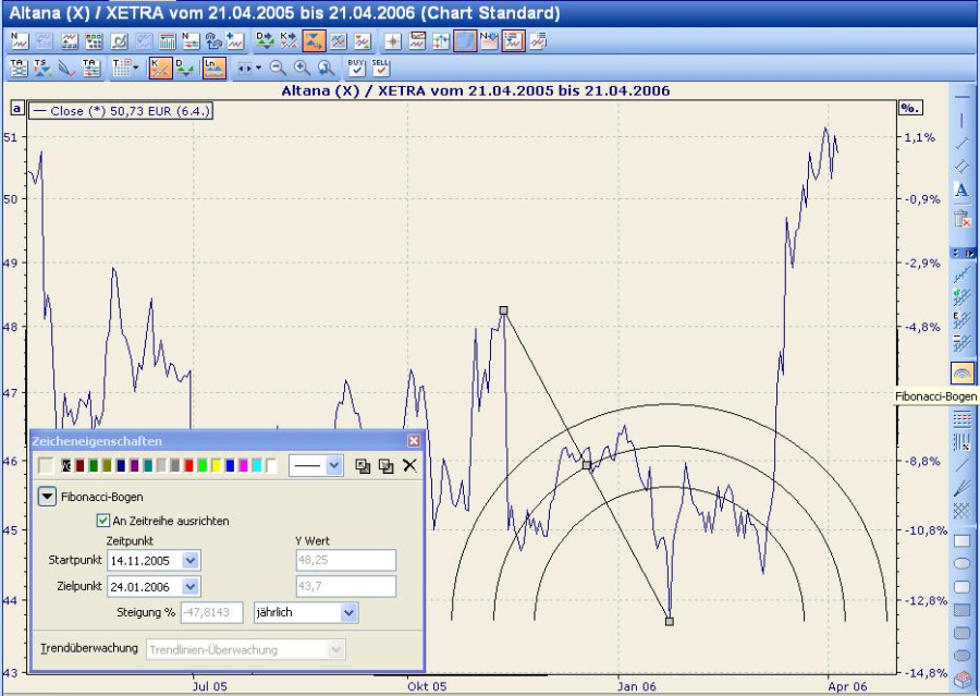 Zeichnen Sie die Fibonacci-Bögen ein, indem Sie eine Trendlinie zwischen zwei Extrempunkte im Kursverlauf einzeichnen. Es werden die drei oben beschriebenen Bögen gezeichnet.